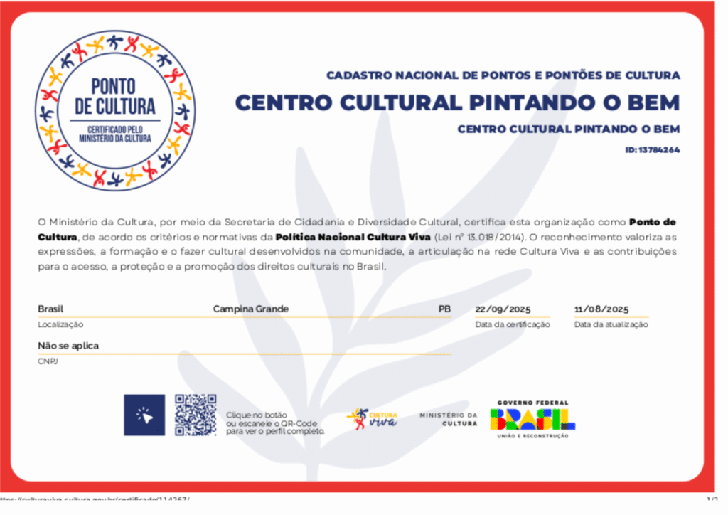 Em 2025, o Pintando o Bem foi reconhecido como Ponto de Cultura, fortalecendo sua presença nas comunidades periféricas e ampliando suas ações com novas tecnologias e parcerias.